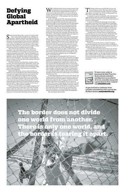The border sends resources and profits one way, and human beings the other. This is how the rich amass great concentrations of wealth: not just by accumulating resources in one place, but also by excluding people from them. This is what all the walls are for. If a prisoner is a person contained by walls, what does that make us? Prisons don’t just contain the people inside them. When the border is everywhere, everyone is transformed into a prisoner or prison guard. It is easy to be bribed by the advantages of citizenship: being able to travel more freely, being allowed to participate legally in the labor market, being able to access what is left of government assistance, being acknowledged as a part of society. Yet these privileges come at a terrible cost, for the documents one person holds only have value because others are without them. Their value is based on created scarcity. As long as there is a border between you and those less fortunate than you, you can be sure there will also be borders above you, keeping you from things that you need. Some people are deported, others are evicted, but the fundamental mechanisms are the same. Who will help you tear down the borders above you, if not the people separated from you by the borders below? Borders are just social constructs—they are imaginary frameworks imposed on the real world. There is nothing necessary or inevitable about them. Were it not for the violence of the believers, they would cease to exist. Crossing the border without documents is a way of resisting. So is getting to know people who are affected by the border in ways you are not, setting out to understand and share their struggles. Together, we can make the border unenforceable—a step towards creating a world in which everyone will be free to travel wherever they desire, to use their creative energy however they see fit, to fulfill their potential on their own terms.