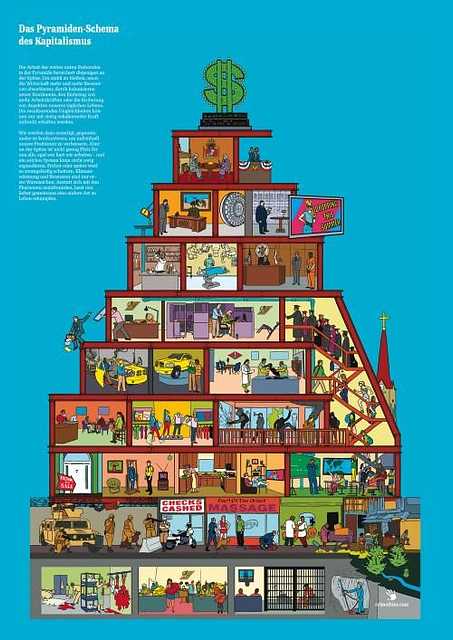 Die Arbeit der weiter unten Stehenden in der Pyramide bereichert diejenigen an der Spitze. Um stabil zu bleiben, muss die Wirtschaft mehr und mehr Ressourcen absorbieren: durch kolonisieren neuer Kontinente, den Einbezug von mehr Arbeitskräften oder die Eroberung von Aspekten unseres täglichen Lebens. Die resultierenden Ungleichheiten können nur mit stetig eskalierender Kraft aufrecht erhalten werden.